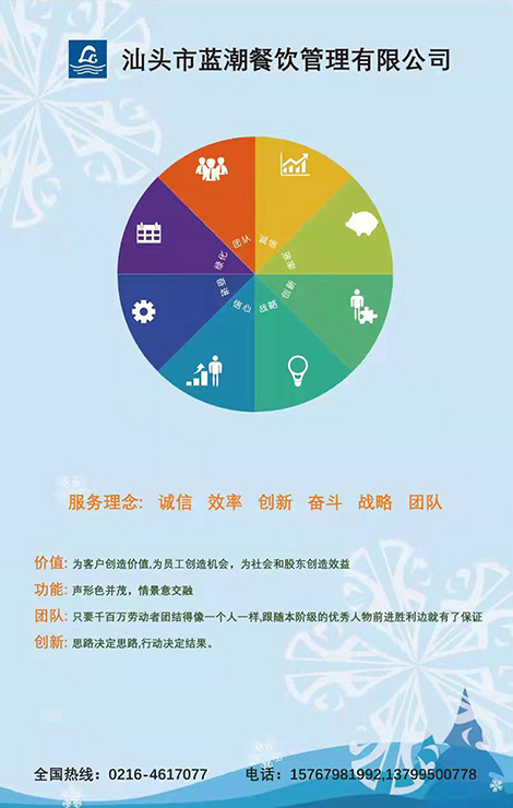 汕頭市藍潮餐飲管理有限公司是以長期承包各大、中型企業食堂為主要業務的公司。本公司對承包食堂行業有著全新的經營理念和多年實踐經驗,是一家實行連鎖經營管理的事業服務機構。業務范圍遍布廣東多個地區,為適應競爭激烈的市場經濟,公司大部分產品直接由公司專業人員采購于主要產區,物美價廉,確保優惠的伙食標準。故此多年來,我公司都注重自檢來完善方方面面工作而贏得眾多公司一致的信賴、支持和合作。希望以我們不斷地提高完善,同致力于開拓新型飲食服務的新思路,為廣大企業的千千萬萬員工生活現代化服務。歡迎廣大新老顧客光臨惠顧,我們將竭誠為您服務!